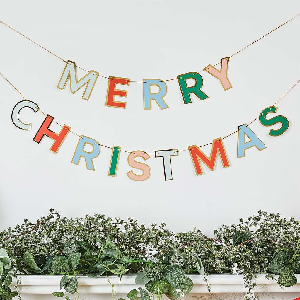 This colourful Merry Christmas Banner will add a festive touch to your home or Christmas party celebration! Pack contains 1 x 2.5m merry Christmas card banner with gold foiling